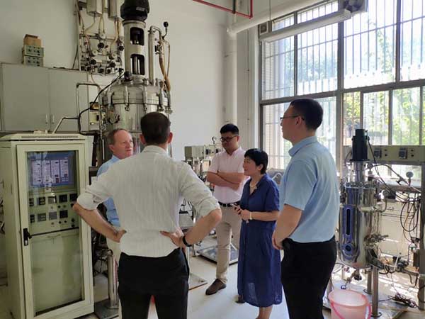 上午9時,Thomas Haas一行首先在儲炬教授和田錫煒博士的陪同下參觀了中試實驗室,并向其介紹工程中心在發酵過程優化和放大方面的技術和設備優勢。隨后,儲炬教授以“Sophorolipids fermentation optimization and high-throughput screening for high-yielding strains”為題,簡單介紹了工程中心的發展歷程,生物過程工程研究領域的技術和裝備積累,以及實驗室平臺建設的情況,同時針對前期合作項目的進展和后期相應工作的計劃進行了詳細的說明。與會期間,Thomas Haas一行和相關師生進行了熱烈且廣泛的討論,為后續進一步加強校企合作以及國際交流奠定了良好的基礎。