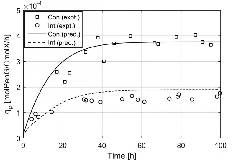 唐文俊等通過對產黃青霉開展多批次不同稀釋率下的恒化實驗、小時級的連續稀釋率變化實驗、秒級的補料速率變化實驗等獲取了大量的精確定量胞內代謝物濃度信息,利用同種類/同工特性建立“池”的概念,利用基礎元素守衡、電子及還原力守衡建立了一個具有5個代謝物池、4個相關調控酶池的結構化細胞代謝模型,并且為之建立了數十個相關動力學描述。最終的模型既能夠成功模擬小時級/天級的反應器內菌量增加、產物積累的過程,也能夠準確描述菌體在遭遇瞬時低糖濃度等不利條件下的應激響應,為與CFD計算流體力學的整合模擬提供了基礎。
