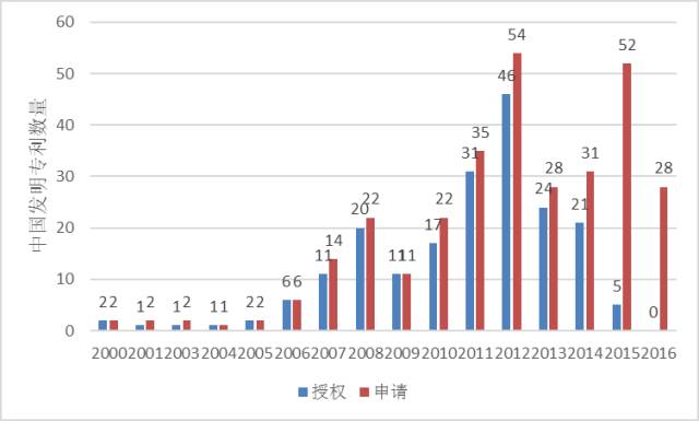(注:圖中所示每年“授權數量”是指當年申請發明專利日后獲授權的數量)