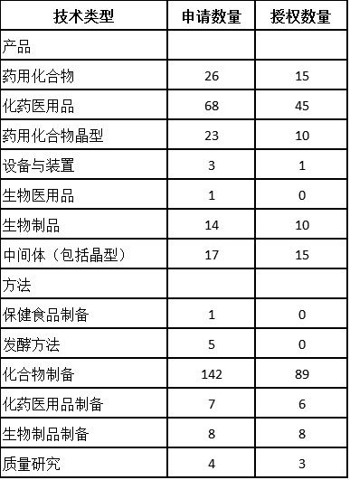 2000年至今,齊魯制藥(包括子公司)共申請中國發明專利312件,其中授權199件(圖2)。發明專利的技術類型涵蓋藥用化合物及其制備、化藥醫用品及其制備方法、晶型及其制備、生物制品及其制備等多個領域(表1)。此外,齊魯制藥(包括子公司)共申請PCT專利15件,亦涵蓋藥用化合物及其制備、晶型及其制備等多個發明主題