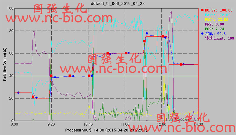 通過我們自主開發的動物細胞四氣控制算法,使得溶氧波動范圍在±0.5%內,pH波動在±0.01以內。