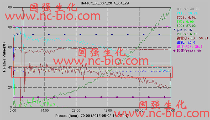 從過程曲線上可以看出,隨著細胞的生長,氧消耗提高,算法控制總流量恒定,氧氣供應逐漸增加,空氣供應逐漸減少,從而提高供氧水平維持溶氧恒定;同時控制二氧化碳流量,使得pH控制在一個跟小的范圍。