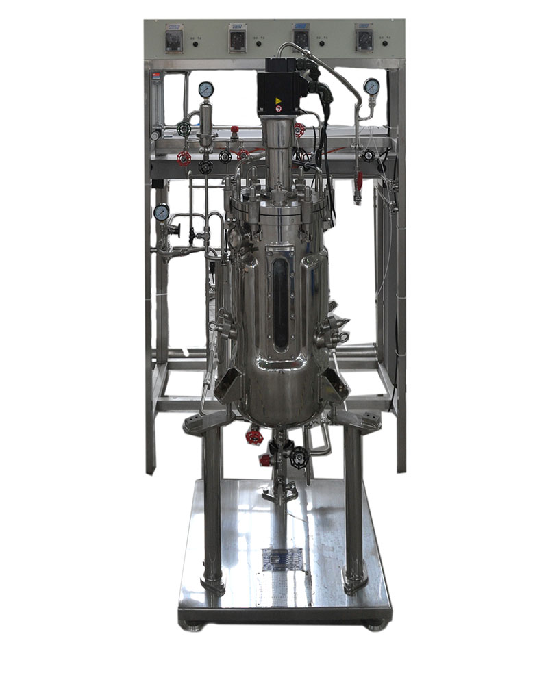 經過逐步的研究和改進,罐體夾套和管架采用304不銹鋼,罐體與液體接觸部分采用316L不銹鋼,美觀耐腐蝕性好,壽命長。標配4臺集成式蠕動泵,可選配蘭格或其他品牌獨立式蠕動泵,每一路補料均有電子秤計量,最大量程可以配置15公斤,足夠使用10L血清瓶作為補料罐。pH和消泡可以進行聯動控制,補料速率采用占空比進行控制。攪拌系統使用交流伺服電機,體積小、壽命長、轉速控制精確;標配三層六平葉漿,攪拌槳位置可調。標配質量流量計,集控制和測量一體,直接輸出標況流量。標配罐頂壓力傳感器。標配罐體稱重。