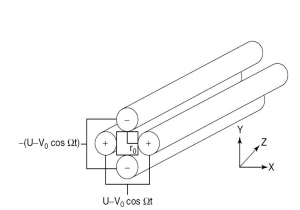 四極桿(Quadrupole):由四根帶有直流電壓(DC)和疊加的射頻電壓(RF)的準確平行桿構成,相互對角的兩根桿串聯為一組(圖 1.2)。一組加直流高電壓(正極桿);另一組加直流低電壓(負極桿)。兩組電壓值相等,極性相反。另外,所有四極桿上都同時加射頻電壓。相對的一對電極是等電位的,兩對電極之間電位相反。當離子在進入四極桿后,由于受到射頻(RF)電場和直流(DC)電場的作用會開始非常復雜的振蕩運動。如果在某一時刻,DC和RF保持不變,如若離子的核質比(m/z)太低,這個離子將被推離軸向,撞上正極桿而不會到達四極桿的出口。如果離子m/z太高,趨向負極桿的振蕩增加,直到撞擊到負極桿或從四極桿的邊緣被彈出去。只有當離子的m/z在特定值上時,其在四極桿內的才會穩定振蕩通過,有且只有這樣的離子才能從四極桿的另一端出去被檢測器檢測到。初期的四極桿濾質器通常采用雙曲面桿,而不是柱形桿。從理論上來說,雙曲面桿能比圓柱桿形成更加精確的四級場,但其較之圓桿加工會更加困難。因此如若能用圓柱桿代替雙曲柱桿,可以大大降低加工難度。于是,有人提出如果圓桿半徑r與桿間場的半徑r0滿足r=1.148r0,則圓桿間形成的電場能夠非常好的近似作為理想的雙曲面形成的四極場。