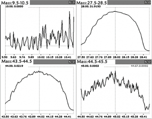 過程質譜儀直接測得的數據是各個m/z處的離子電流強度,通常我們可能認為50%的氮氣和50%的氧氣應該會產生相同的檢測信號,但是,實際的情況是在離子源轟擊過程中,氮氣和氧氣被轟擊掉一個電子的比例已經通過四級桿的比例都是不一樣的。于是,又人為的乘以了一個靈敏系數,所得到的數據人為是相對準確的信號強度。從理論上來說,每一種物質對都會有一個不變的靈敏系數,實際上過程中氣體組分比例的差異對靈敏度會有一定的影響,但是不是太大。另一個問題就是被轟擊產生離子碎片。比如質量數為44的二氧化碳,在轟擊過程中會產生幾種m/z比不同的碎片。其中有一種m/z為28,與氮氣的特征離子m/z相同。我們必須區分m/z為28的離子,氮氣和二氧化碳分別貢獻的比例。此外,設備本身的噪音也要考慮。如果設備的制造精度或者其他問題,在各個m/z處都會有不同強度的噪音信號,需要用不會產生與我們要監測的離子碎片m/z比相同的碎片的氣體進行標定。但是,以我們的使用經驗來看,一般買來的高純氣中也會混雜極少量空氣,其濃度足以被過程質譜檢測。我們通常做法是直接將背景置零,因為對于精密的設備,噪音可以忽略(通過用最大放大的倍增器檢測空氣中成分不可能產生的碎片的m/z)而所用的碎片信號最低13CO2(m/z為45)產生了信號在0.0001以上,目測信噪比大于5。