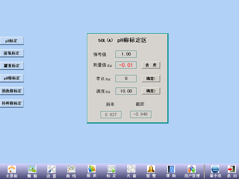 點擊左側pH稱標定、消泡稱標定、補料稱標定或罐重進入對應稱重標定。