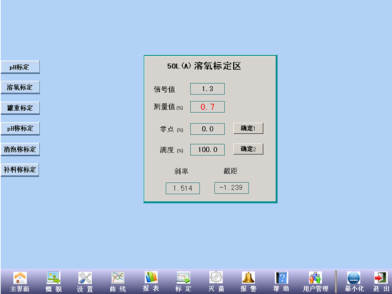 主菜單中按下標定按鈕,可進入圖1所示界面。左側菜單可進入不同標定內容。如果出現錯誤提示,按照“15-50-50L發酵控制系統的使用-1”相同方法輸入管理員級別的用戶名密碼進入。